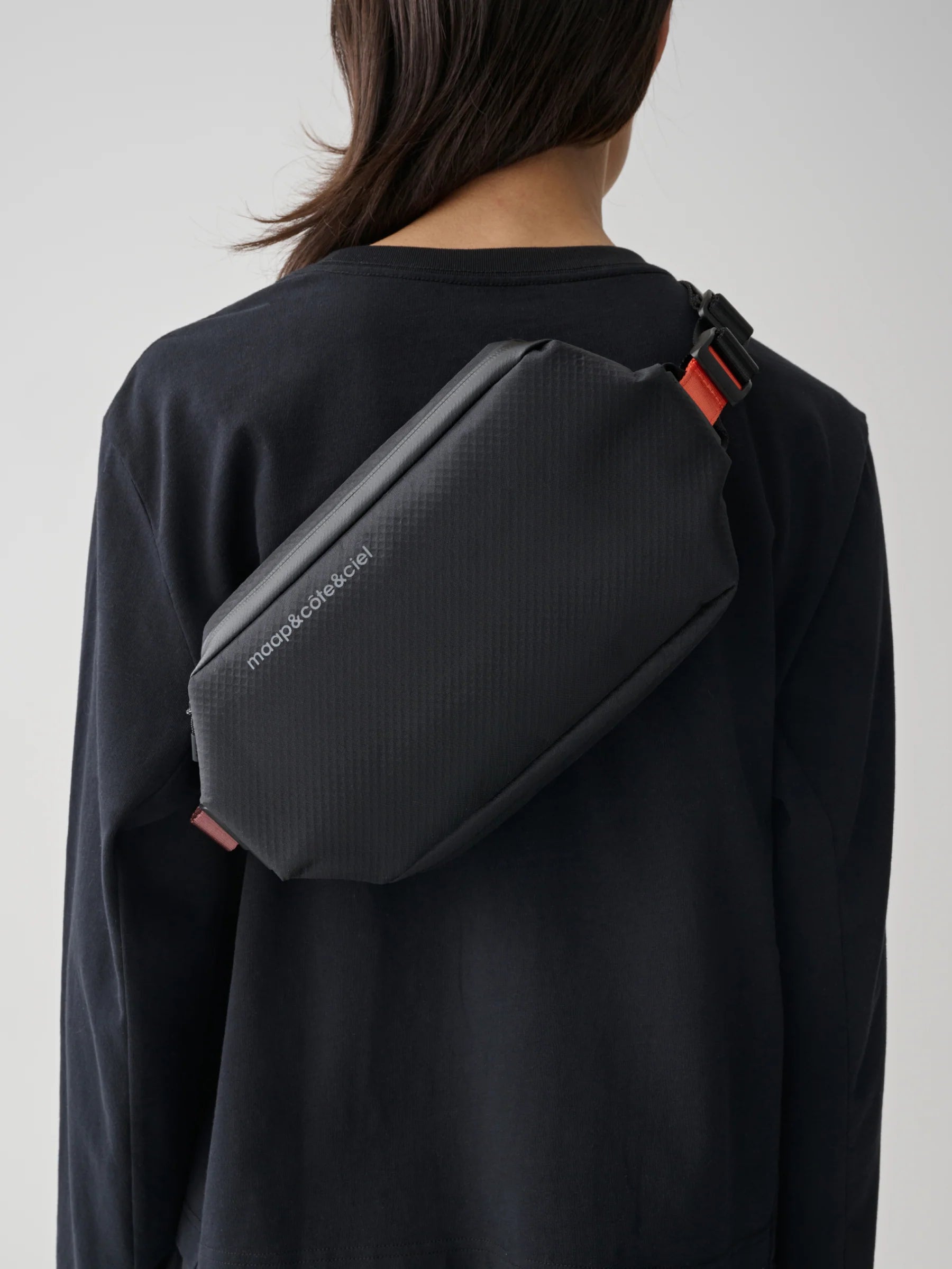 Intersecting movement. art and progression with maap&côte&ciel. Bringing to life the Sling Bag. an origami of folded and stitched materials that create organic space in a lightweight 2.4 L sling bag. Traverse. explore and move freely.